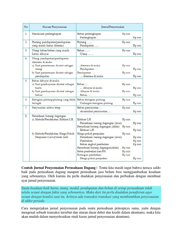 Contoh Soal Dan Jawaban Jurnal Penyesuaian from imgv2-2-f.scribdassets.com Kondisi tersebut adalah belum dicatatnya sebuah transaksi yang sudah terjadi dan transaksi yang tercatat tidak sesuai dengan apa yang terjadi. 24 bulan = rp 125.000 x 6 bulan = rp 750.000. Materi jurnal penyesuaian perusahaan jasa. Jurnal penyesuaian & kertas kerja tahap pengikhtisaran siklus akuntansi perusahaan jasa jogohera.blogspot.com 8. Itulah penjelasan tentang beberapa contoh jurnal penyesuaian pada perusahaan jasa dan dagang serta beberapa penjelasan tentang penjelasan adjusting journal entry. Demikian pembahasan tentang pencatatan ayat jurnal penyesuaian (perusahaan jasa). Soal jurnal penyesuaian perusahaan jasa sebuah perusahaan jasa tentunya sangat memerlukan yang namanya ayat jurnal penyesuaian ajp untuk menyesuaiakan beberapa transaksi yang terjadi ketika sudah di akhir periode ditambah lagi apabila muncul sebuah perusahaan demi menghindari adanya kesalaham baik pada nama akun atau saldo yang sesungguhnya. Perlengkapan (supplies)perlengkapan merupakan berbagai unsur yang dibeli oleh perusahaan guna mendukung operasi perusahaan.perlengkapan yang telah diperoleh akan digunakan sehingga perlengkapan yang telah terpakai akan menjadi beban (expense) ada dua pendekatan yang digunakan:
