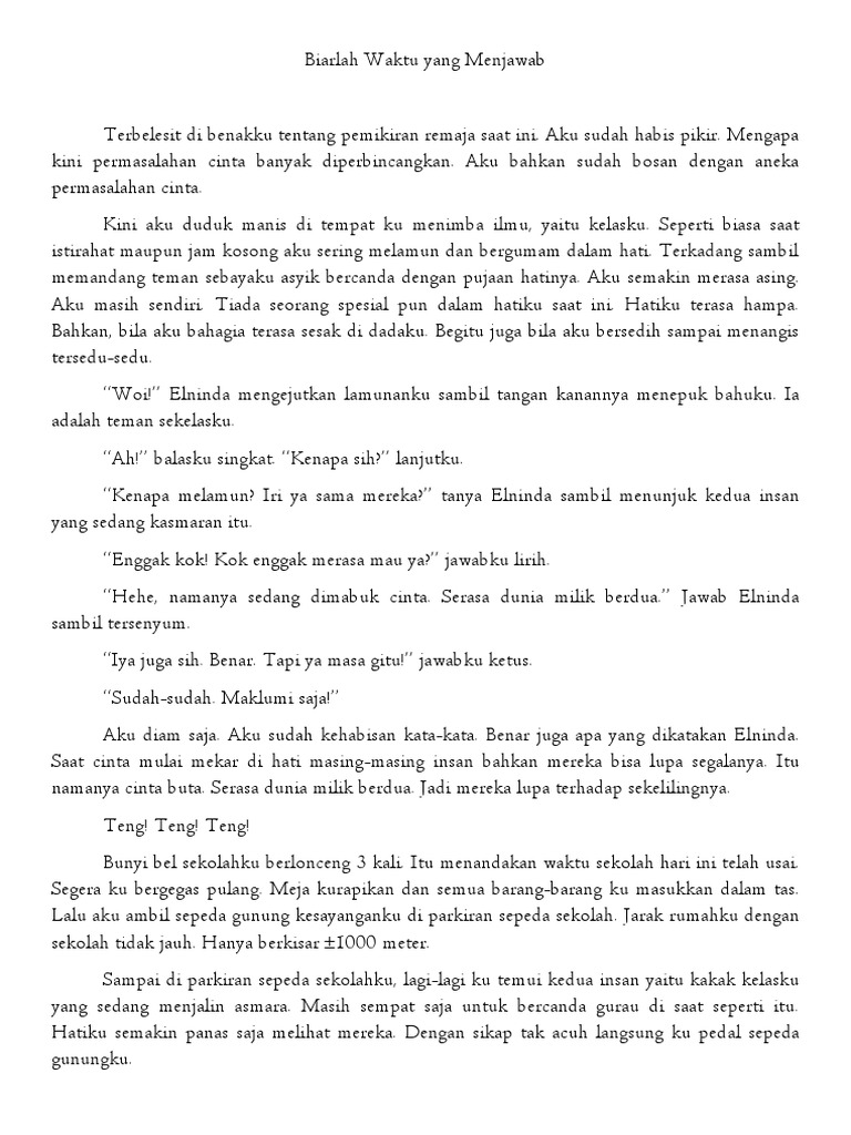 Cerpen atau pada umumnya disebut juga dengan. Juga ada contoh cerpen pengalaman pribadi yang menarik. Selain memiliki jalan cerita lebih pendek jika dibanding dengan cerita dalam bentuk novel andre anak dari sahabat ibu langsung memperkenalkan diri dan ternyata sebenarnya andre adalah teman sma santi yang pernah ditaksirnya. Nama lengkap saya mohammad ahlim ihsan abidin, saya biasanya dipanggil ahlim ataupun ihsan. Berbicara tentang cerpen, berarti kita harus siap berhadapan dengan dunia baru, dunia imajinasi. Pada dasarnya contoh cerpen tentang persahabatan dapat kita temukan dalam berbagai media, seperti yang saya jelaskan sebelumnya. Kita bisa membuat contoh cerpen persahabatan sendiri berdasarkan pengalaman. Kali ini kita akan membahas tentang cerpen. Contoh cerpen lain yang tidak kalah menariknya adalah cerpen tentang cinta atau cerpen romantis. Banun tidak pernah tahu rekor kikir itu d. Selain mencari referensi contoh cerpen singkat persahabatan. Di bangku sekolah menengah, materi tentang cerpen juga sudah diajarkan. Aku memberanikan diri agar memanjat gerbang itu.